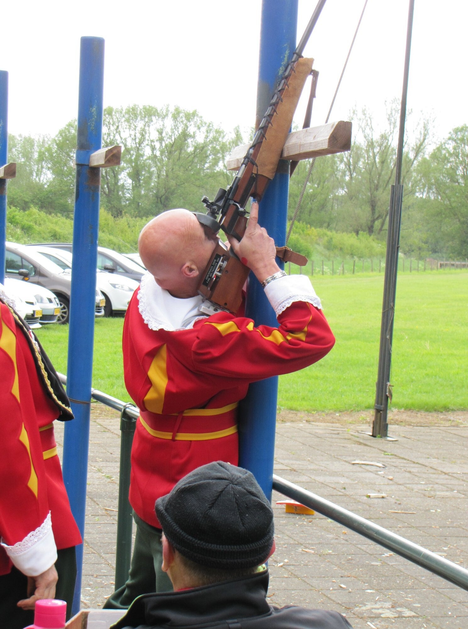 Geweerschutters bij het Sint Dionysiusgilde schieten met enkelschots flobert .22 geweren op de metalen buis waarop een metalen dop, de zogenaamde wip, ligt. De metalen buis en klep zijn bevestigd in een kogelvanger zodat het lood van de kogel wordt opgevangen. De metalen dop kan in afmetingen variëren waardoor deze meer of minder over de metalen buis heen steekt. De kunst van het geweerschieten zit in het afschatten van de afstand op de buis waar de kogel de buis moet raken om de dop van de buis te schieten. De dop is bevestigd aan een touw, door aan het touw te trekken valt de dop weer op de metalen buis en kan het volgende schot gelost worden. De metalen buis en dop bevinden zich op 17 meter hoogte en het geweer ligt op een oplegpaal op een afstand van 6 meter van de schietboom. In de volksmond wordt deze discipline Brabants wipschieten genoemd welke door veel schuttersgilden in Noord-Limburg en Brabant wordt beoefend. Het Brabants wipschieten moet niet verward worden met het Limburgs böllekes schieten dat door de Limburgse schutterijen met een veel zwaardere schuttersbuks wordt beoefend.